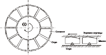 При эксплуатации наиболее уязвимым элементом гадроагрегата является его ПП, состоящий из ступицы ПП, укрепленной на валу гидрогенератора, нижняя часть которой снабжена диском с полированной поверхностью – зеркалом ПП. Вся вертикальная нагрузка передается через зеркало ПП на сегменты ПП (рис.24). Сегменты ПП расположены в один или два ряда на стуле ПП, воспринимающем нагрузку ПП Стальной сегмент (рис.25) состоит из тела сегмента 2 и подушки 1, покрытой слоем антифрикционного материала - баббита или фторопласта.