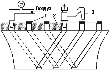 из расхода воздуха. В засоренном канале этот расход будет уменьшенным. На рис.17: 1 - пробка, затыкающая соседние каналы; 2 - продуваемый канал; 3 - водовоздушный дифманометр.