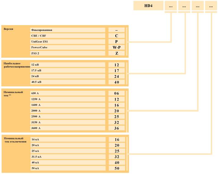 Код HD4/C 12.16.25 определяет выкатной выключатель для кассеты CBE или модуля CBF с наибольшим рабочим напряжением 12 кВ, номинальным током 1600 А и номинальным током отключения 25 кА.