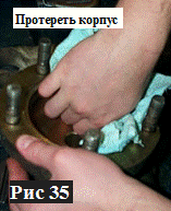 | 3.2.2.14 | Корпус и поршень промыть в уайт – спирите, высушить и протереть чистой безворсовой ветошью (рис 35) и осмотреть на наличие на рабочих поверхностях царапин, заусенцев, трещин. | --- | ВК | Чистота внутренней цилиндрической поверхности корпуса и поршня и отсутствие на них ниток оторвавшихся от обтирочной ветоши. | Ветошь, лупа, наждачная шкурка, полировальная паста (ГОИ, Крокус или др.), кусок войлока 100×100 или насадка на дрель | Наличие на цилиндрической поверхности корпуса царапин, заусенцев. Трещины на корпусе. | Царапины, заусенцы убрать мелкозернистой шлифовальной шкуркой, затем отполировать поверхность цилиндра до Ra 0,4 - 0,32. Заменить корпус. | |||