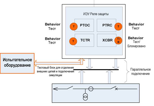 Для проверки различных режимов подключено испытательное оборудование. Проверяемое устройство получает измеряемые величины (токи) от стандартного трансформатора, подключенного параллельно. Сигналы отключения на катушку выключателя также передаются по параллельным проводам.