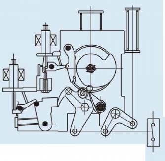Ось кулачка начинает вращение по часовой стрелке под воздействием включающей пружины (7), которая связана с храповиком (8). При возбуждении выключающего электромагнита выключающая защелка поворачивается против часовой стрелки, собачка отходит от пальца, установленного на храповике (8), и кулачок (11), который установлен на оси (10) поворачивается по часовой стрелке, рычаги А и В поворачиваются против часовой стрелки, а выключающая пружина (9) сжимается. Подвижный контакт дугогасительной камеры перемещается вверх.