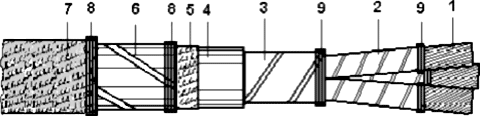 изоляцией: 1- токопроводящие жилы; 2 - фазная изоляция; 3 - общая (поясная) изоляция; 4 - герметичная оболочка; 5 - подушка под броней; 6 - броня из стальных лент; 7- наружный защитный покров; 8 - проволочный бандаж; 9 - бандаж из ниток.