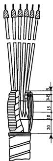 Разделку производят по размерам, показанным на рис. 7, затем разводят жилы, надевают на них отрезки трубки жильной и усаживают их прогревом паяльной лампой или газовой горелкой. Прогрев ведется от корешка кабеля. Лентой-регулятором обматывается корешок разделки. На нагретую до температуры 60—70 °С оболочку, на жилы кабеля надевают перчатку и усаживают ее прогревом. Усаженная перчатка не должна иметь морщин, из-под кромок юбки и пальцев должен выступать избыток клея-герметика.