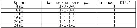 Допустим приемник исправен. Приходит сигнал вызова с частотой fпрм и длительностью 32mC. На входе инвертора D1.4 - уровень «лог0», на входе «D» регистра D8.1 - уровень «лог1». По тактовым импульсам на «С»-входе (0,25mC с периодом 4mC) информация с «D»-входа начинает записываться в регистр. Это может быть представлено в виде таблички: