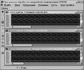 Файлы с данными аварийного процесса могут быть получены непосредственно из регистратора по сети либо с дискеты. В регистраторах используются дискеты формата 1.44 MB (720 K в РЕКОН-05). Дискета из регистратора с записанным аварийным процессом (данными) устанавливается в компьютер. Установите в Windows Explorer или Norton Commander режим полного вывода информации о файлах и убедитесь в наличии на дискете (или жёстком диске) файлов с именами RECONxxx.yyy. Цифровой индекс xxx – последние три цифры заводского номера регистратора, устанавливаемый изготовителем, а yyy указывает на порядковый номер записанного процесса. Необходимо проанализировать дату и время создания файлов, их размер. Наличие в расширении имени файла буквы P указывает на то, что данный процесс был записан не полностью в связи с нехваткой места в памяти регистратора (или на дискете для «Рекон-05»). Если же файлы, помеченные буквой P, имеют нулевую длину, аварийные процессы произошли тогда, когда память регистратора (или дискета для «Рекон-05БС») уже была полностью заполнена.