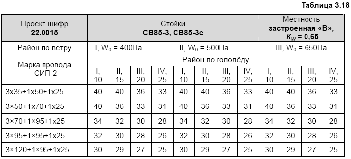 Расчетные пролеты в застроенной местности "В" даны с использованием при расчете коэффициента Kw = 0,65 (таблица 3.18). а в незастроенной местности "A" Kw =1.0 (таблица 3.19). при этом коэффициенты надежности