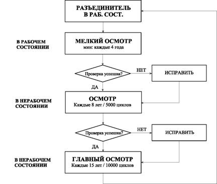| С. РАЗЪЕДИНИТЕЛЬ В НЕРАБОЧЕМ СОСТОЯНИИ | ОСНОВНОЙ ОСМОТР: С.1) Сделать полный осмотр разъединителя, как указано в пункте В. С.2) Проверить износ основных компонентов, состояние изоляторов и состояние механических регулировок, выполненных во время первой сборки (смотри инструкции по эксплуатации). При обнаружении каких- либо отклонений, следует восстановить первоначальные условия. В случае замены узлов или элементов следовать указаниям инструкций по эксплуатации. Связаться с Alstom в случае поломок или сомнений в правильности восстановления требуемых условий. | Каждые 10 лет или каждые 1000 циклов | Каждые 10 лет или каждые 2000 циклов | Каждые 12 лет или каждые 3000 циклов | Каждые 15 лет или каждые 10000 циклов |