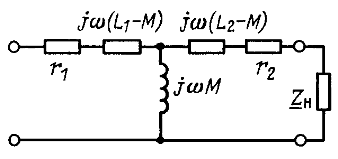Схема двух контуров с индуктивной связью (см. рис. 7.1) может быть заменена эквивалентной схемой без индуктивной связи. Для этого соединим между собой два нижних вывода схемы (режим при этом не изменится). Части контуров с элементами
