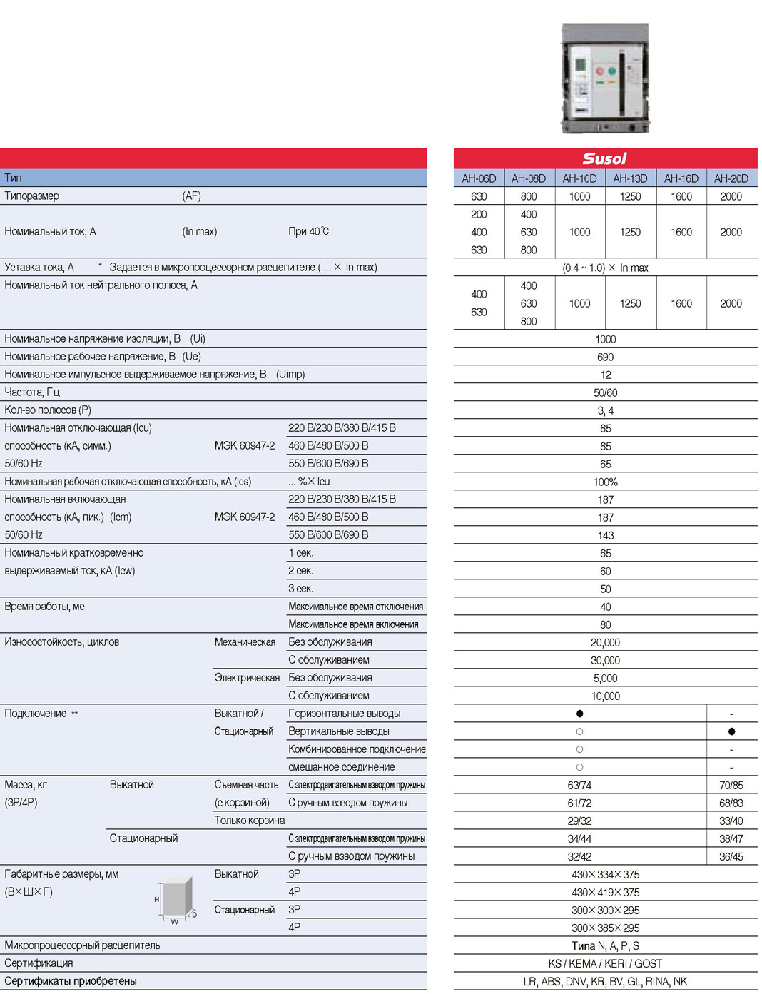 * См. характеристики микропроцессорного расцепителя. ** •: Стандартное исполнение, О: Опция