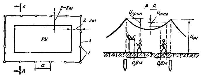 Рис. 12-4. Контурный заземлитель. 1 — соединительные стальные полосы; 2 — стальные трубы.