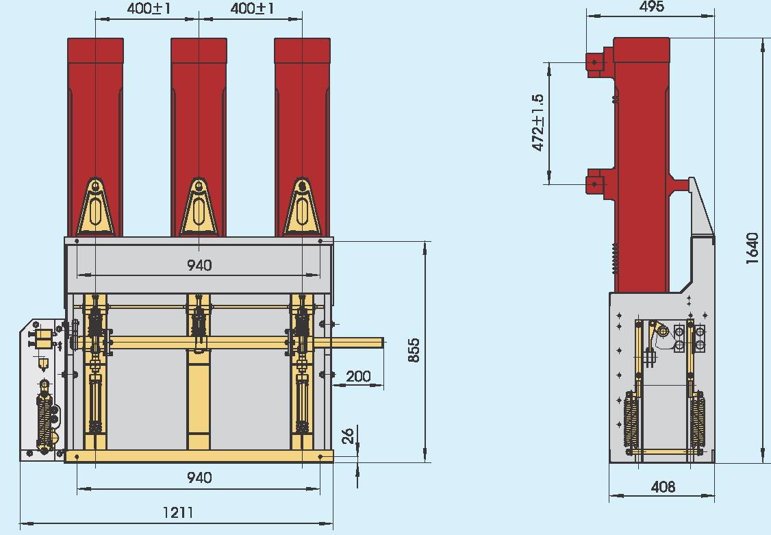 Вакуумная дугогасительная камера трехфазной цепи расположена внутри залитого эпоксидной смолой изолирующего цилиндра, это позволило существенно повысит прочность изоляции между фазами, устранить зависимость параметров выключателя от внешней атмосферы, не допустить попадания на контакты главной цепи пыли и посторонних веществ, а также уменьшило общие габаритные размеры автоматического выключателя.